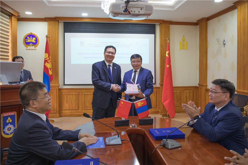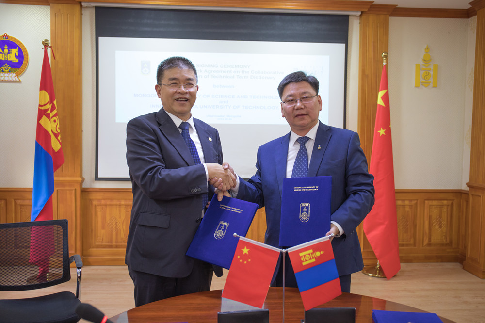期间,金瑞与蒙古国科技大学校长巴·敖其尔巴特举行会谈,双方围绕科技创新、共同申办孔子学院、互派驻校代表、联合培养人才、共建实习实践基地、专业技术人员继续教育等方面的合作进行了深入的沟通与交流。金瑞代表内蒙古工业大学与蒙古国科技大学签署合作编纂“中蒙科技术语工具书”框架协议。国际教育学院院长冯银虎代表我校向蒙古国科技大学应用科学学院“2+2化工专业培养项目”学生赠送教科书。