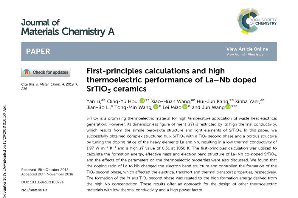 近日材料科学与工程学院王俊教授指导的硕士研究生李艳在JCR一区TOP期刊《Journal of Materials Chemistry A》发表了题为“First-principles calculations and high thermoelectric performance of La-Nb doped SrTiO3 ceramic”的科研论文。《Journal of Materials Chemistry A》是由英国皇家化学学会出版的科学杂志,内容涉及能源和可持续性相关的新材料合成、性能和应用等,2017年最新影响因子为9.931。