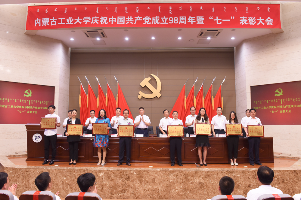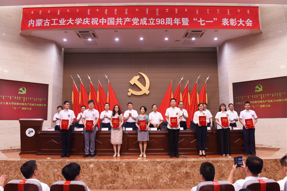全体参会人员奏唱国歌。副校长栗文义宣读《内蒙古工业大学党委关于表彰优秀共产党员、优秀党务工作者和先进基层党组织的决定》。崔昭霞等60名共产党员、包道日娜等40名党务工作者、化工学院党委等40个基层党组织受到表彰。化工学院党委书记王凯,马克思主义学院马克思主义基本原理及中国化党支部书记陈虹,材料科学与工程学院教师党员代表陈芙蓉,信息工程学院党委委员、团学工作办公室主任、行政党支部书记许霞4位同志分别作为基层党组织、教师党员和党务工作者代表结合各自实际,就工作开展情况和个人事迹作交流发言