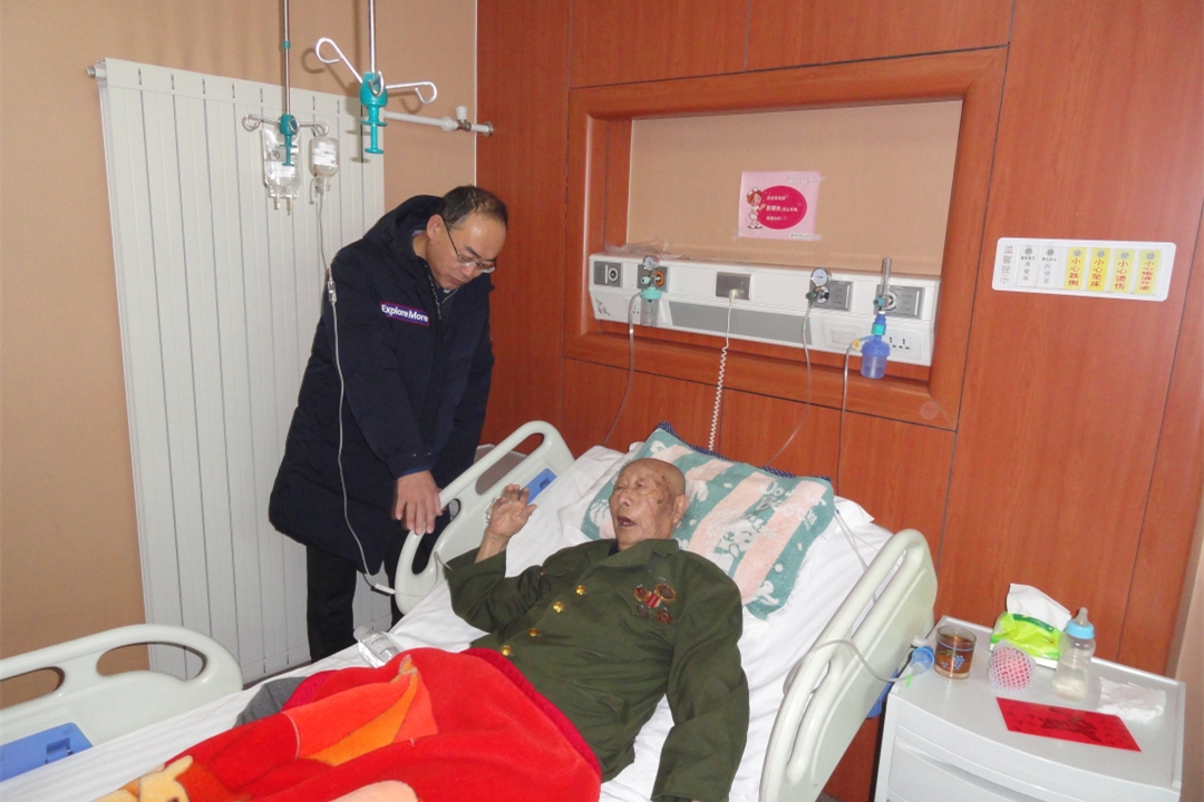 90岁离休干部米富得知校领导来,拖着行动不便的身体毅然穿上当年的军装,佩戴一生累积的荣誉勋章纪念章,向前来慰问的校领导敬以长久的军礼,并欢喜地拉着校领导闲话家常。老同志坚定地革命信念和乐观的生活态度令人动容。