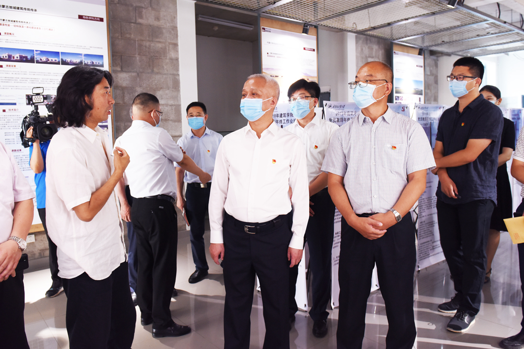 杨伟东一行建筑馆参观并取了张鹏举教授关于建筑馆从闲置旧厂房经科学规划建设,最终成为一个集上课、办公、科研、自习、研讨、休闲于一体的综合型场所发展历程。还询问解了建筑学院教师党员业绩考核成果展师生获得国际国内奖项的情况。