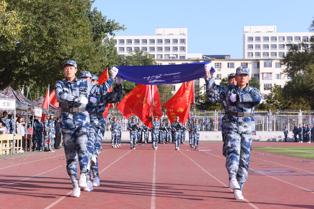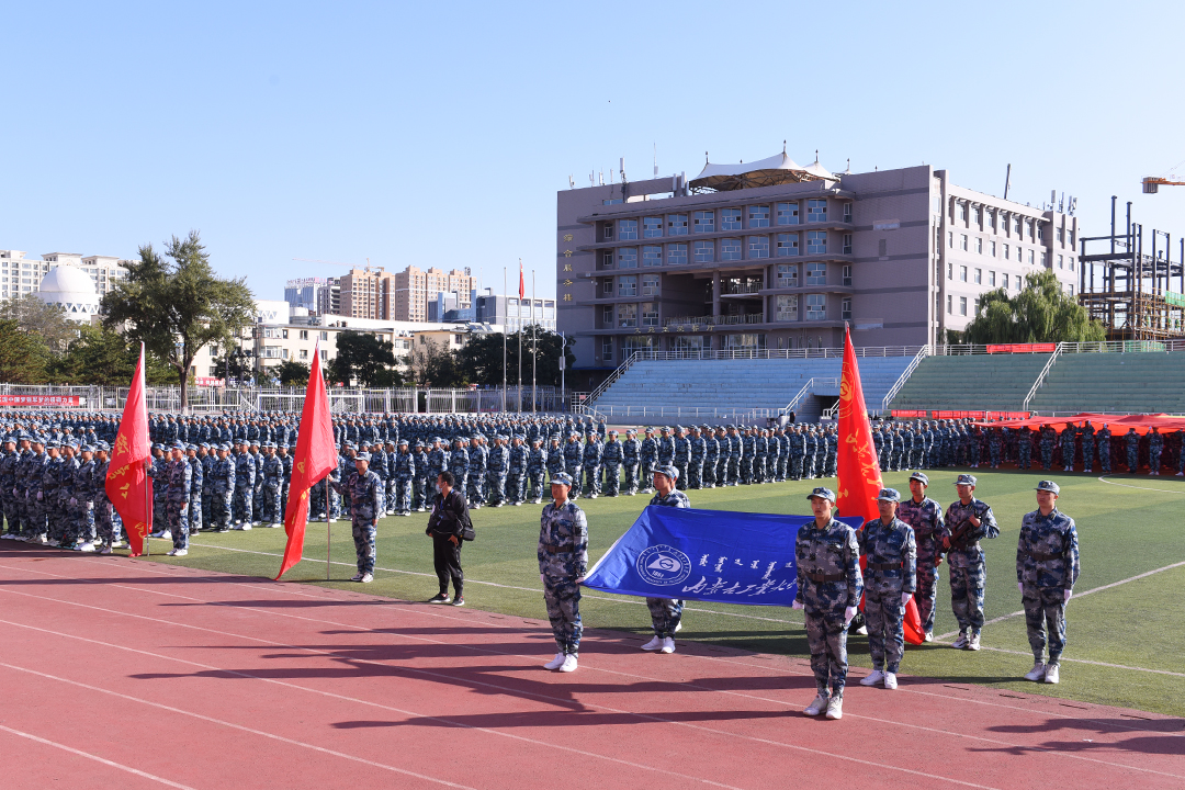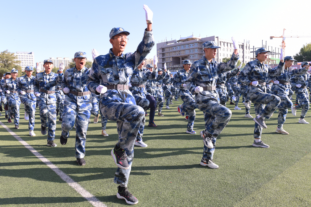 秋高气爽,阳光和煦。历经十余天军事训练的新同学们目光炯炯、军姿挺拔,稚嫩的脸庞增添了一分刚毅,一支支整齐的队列静静等待检阅。雄壮的国歌拉开本次军训总结大会的帷幕,军训汇报演出正式开始。在蒙汉双语的解说下,标兵方阵步伐有力,率先走过主席台,各学院方队迈着整齐的步伐、喊着响亮的口号依次正步走过主席台接受检验。由化工学院、材料科学与工程学院带来的刺杀操和军体拳表演,充分展现了当代大学生的良好精神风貌。整齐划一的动作呈现出气势撼人的效果,不断变换的“1951”“2020”“内工大”造型以及如波浪般涌动的巨型国旗更是表达了同学们对新中国成立71周年的美好祝福。金川校区的全体参训新生合唱了《强军战歌》,用嘹亮的歌声为军训画上圆满句号。