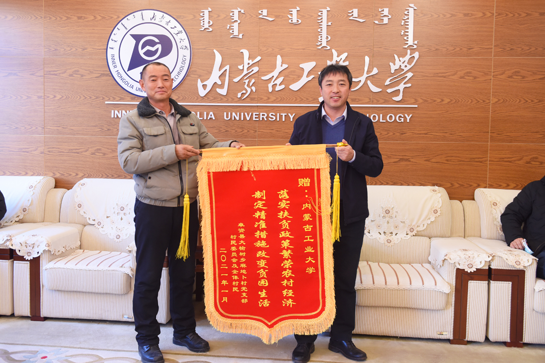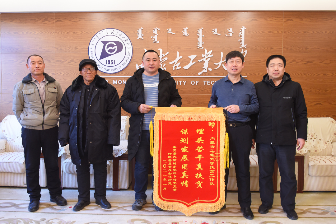 我校扶贫点乌兰察布市卓资县大榆树乡麻地卜村支部书记一行来校赠送锦旗
