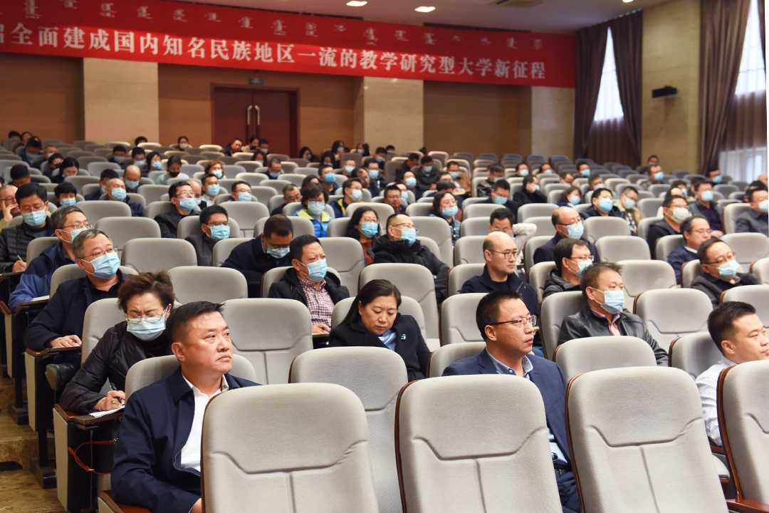 2月27日下午,学校在明德楼第一报告厅召开校党委理论学习中心组(扩大)学习会暨处级干部会议。校党委书记刘志彧主持,校长姚德、校党委副书记栗文义、副校长吕晓琪、校纪委书记阿力坦嘎日迪、副校长韩永全,以及全体副处级以上领导干部参加会议。