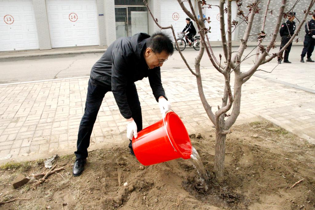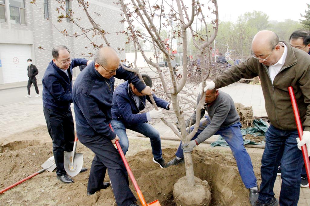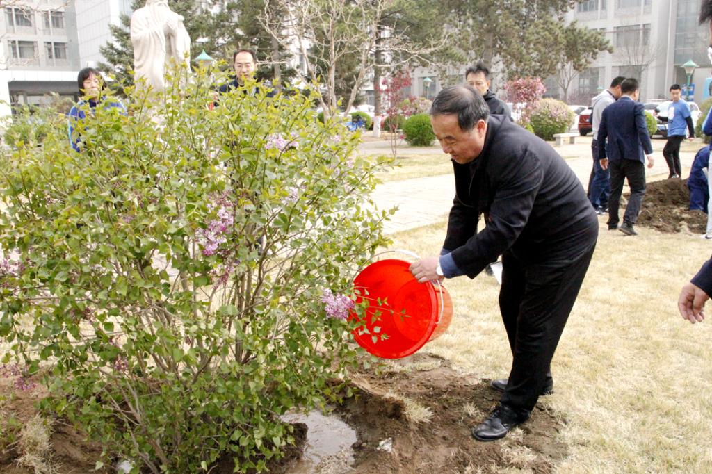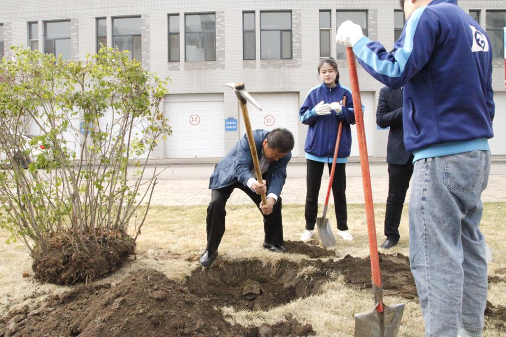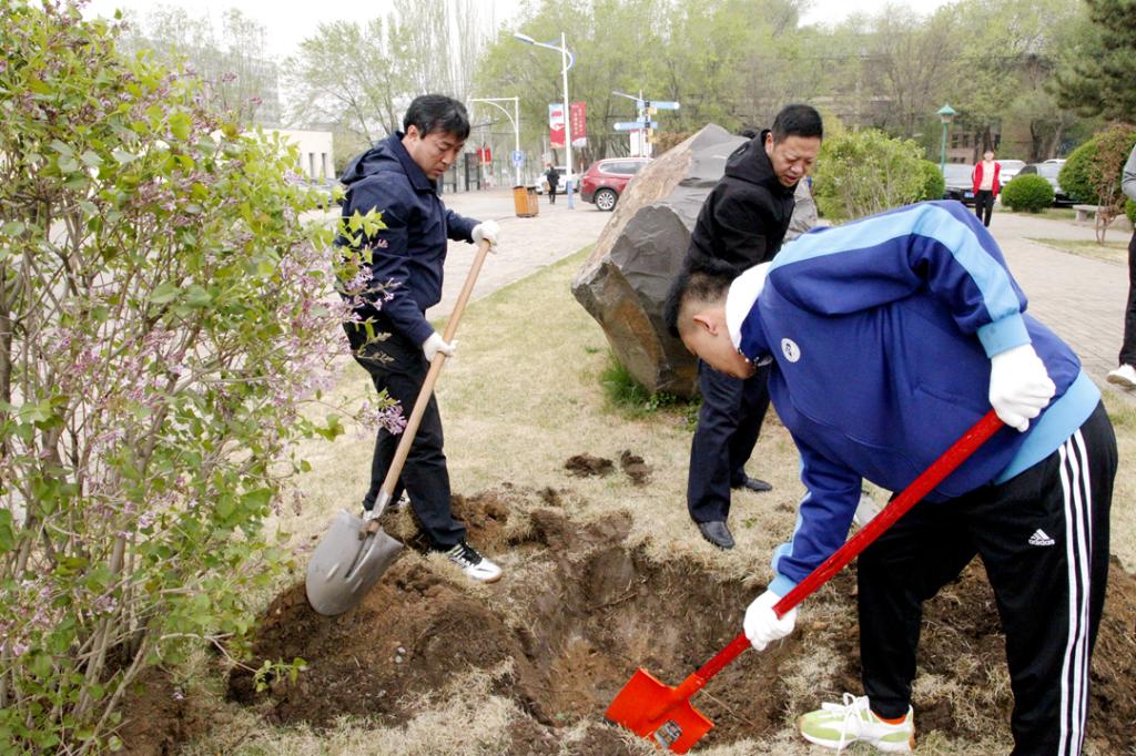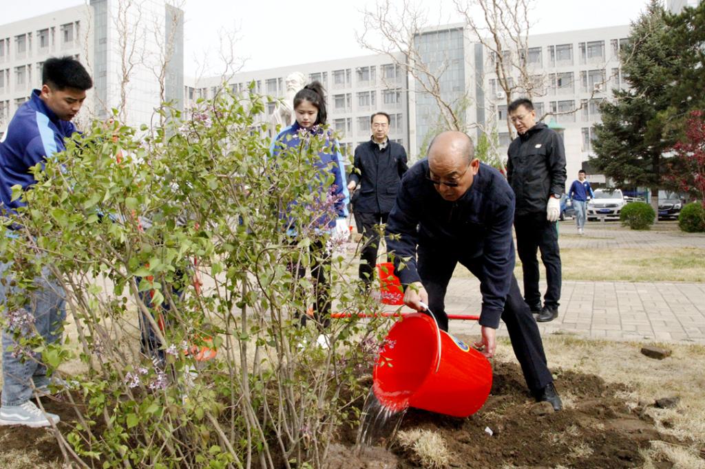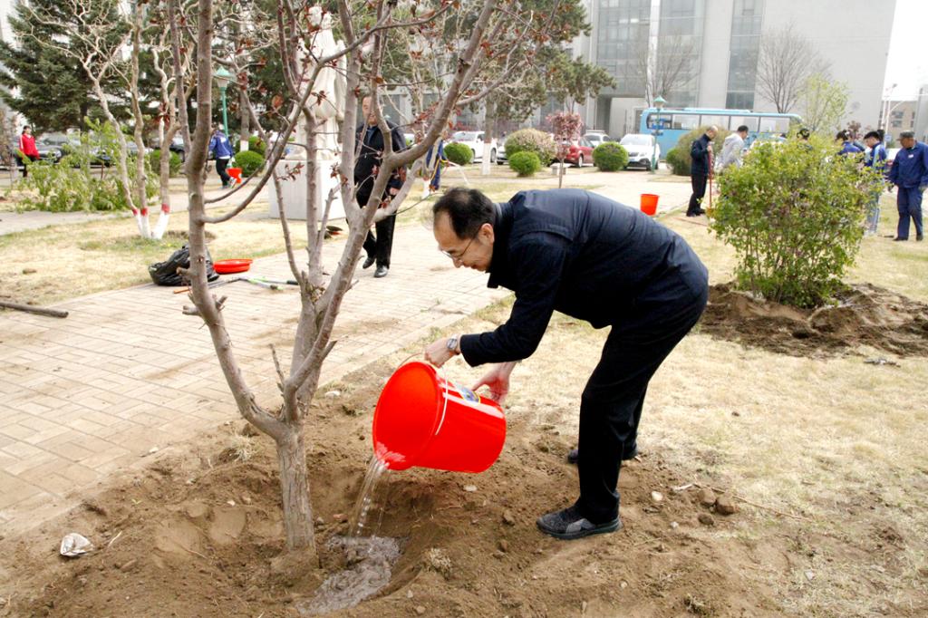 参加植树的领导、师生以小组为单位,齐心协力,挥锹挖坑栽树培土提桶浇水,每个环节都有条不紊、认真严谨,现场一片热闹、繁忙的景象。在大家的共同努力下,山桃树、红叶李、金叶榆五角枫以及丁香、海棠30株不同品种的树木从此工业大学的沃土上落地生根。