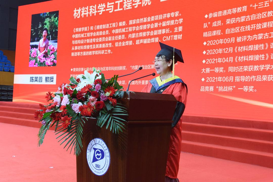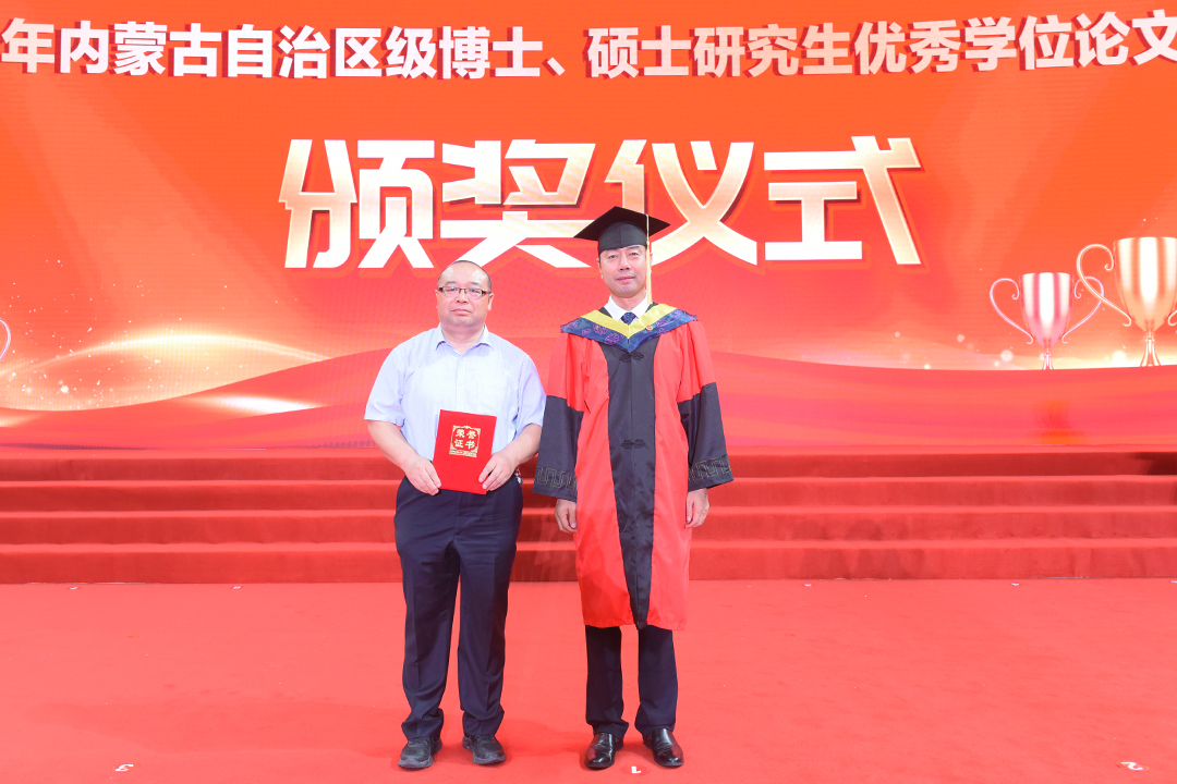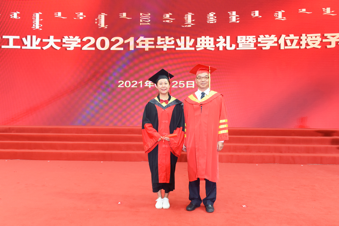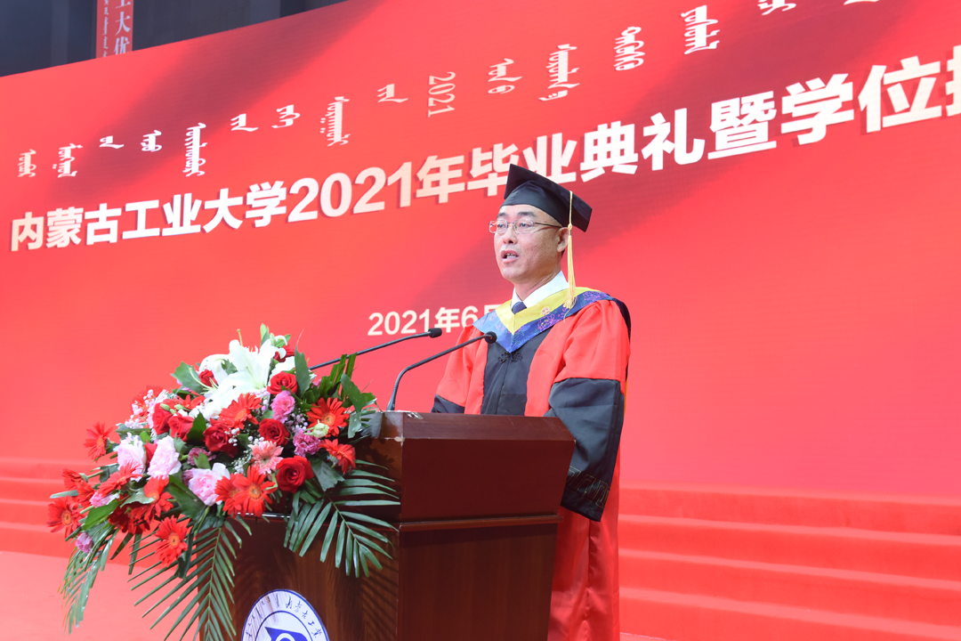 庄严肃穆的国歌后,毕业典礼正式开始。校纪委书记阿力坦嘎日迪宣读内蒙古工业大学《关于表彰2021届校级“优秀毕业生”的决定》,教职工代表为“优秀毕业生”代表颁发获奖证书。副校长峻峰宣读《关于表彰2020-2021年度内蒙古自治区级博士、硕士研究生优秀学位论文指导教师的决定》,校党委书记孙国权为优秀论文指导教师颁奖。