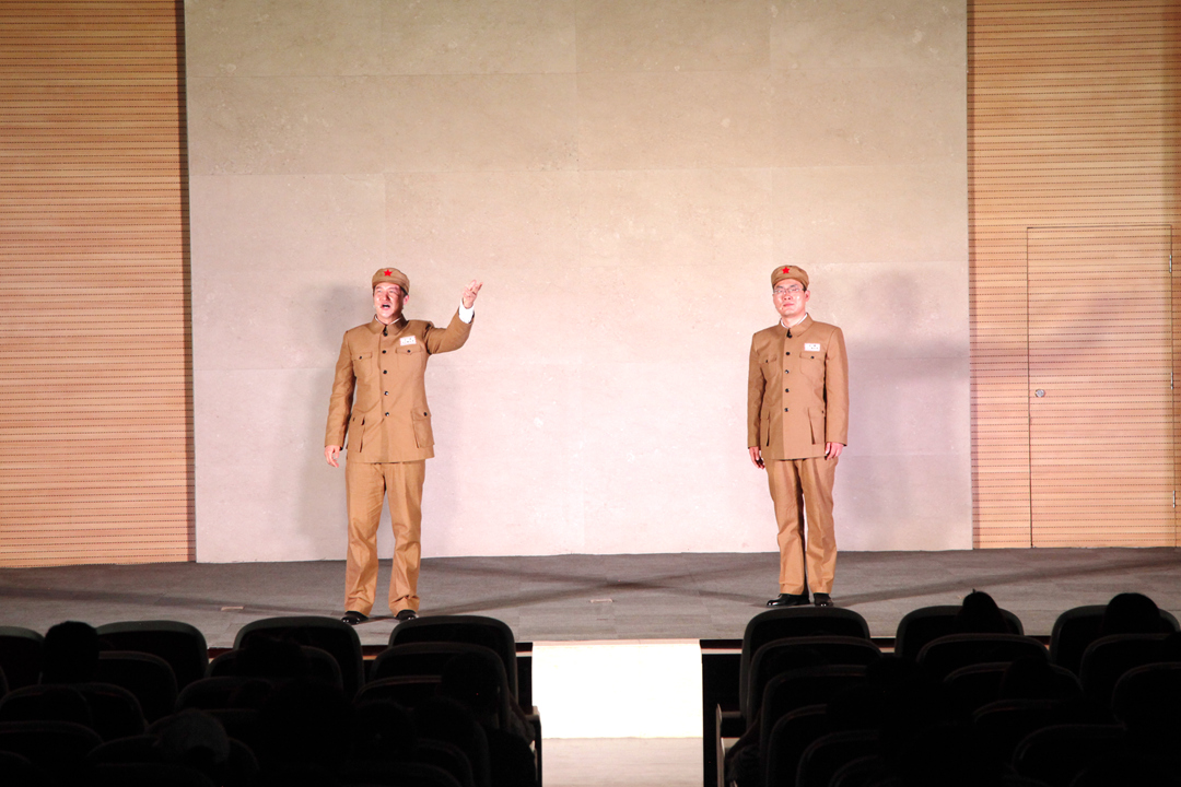 在一声震撼人心的蘑菇云升腾画面中,演出拉开序幕,把现场师生带回到23位“两弹一星”元勋们为之奋斗和奉献的艰辛岁月中。诗剧分为“奔向青春燃烧的土地”“亲爱的祖国,我们回来了”“我愿以身许国”“额济纳河的述说”“迢迢银河路”等五部分。其中“额济纳河的述说”主要讲述了生活在额济纳旗的各族群众为了航天事业“三易旗府”,默默为祖国“两弹一星”事业出贡献的感人故事。