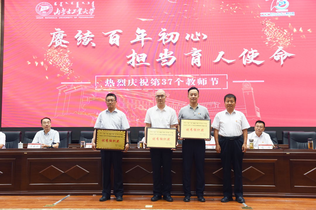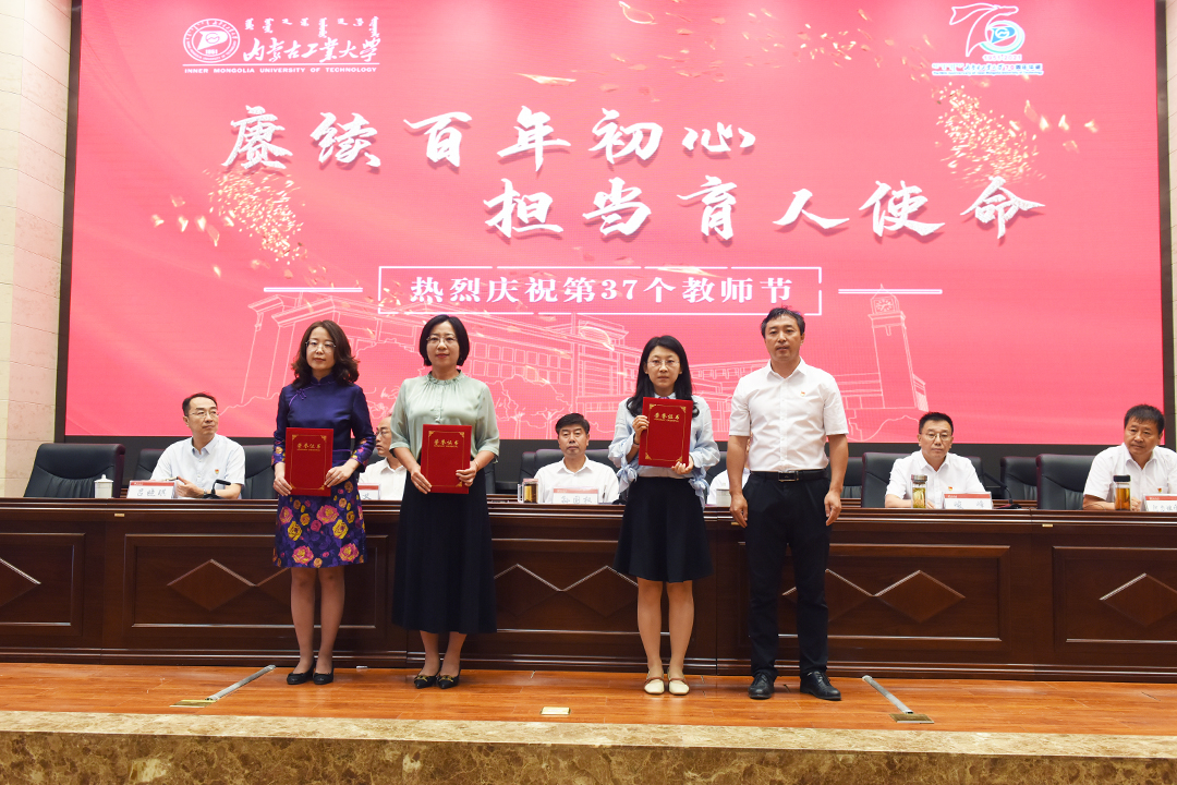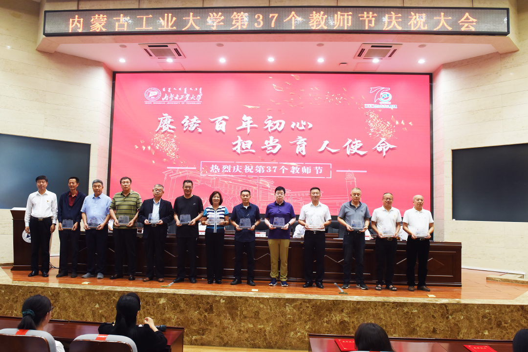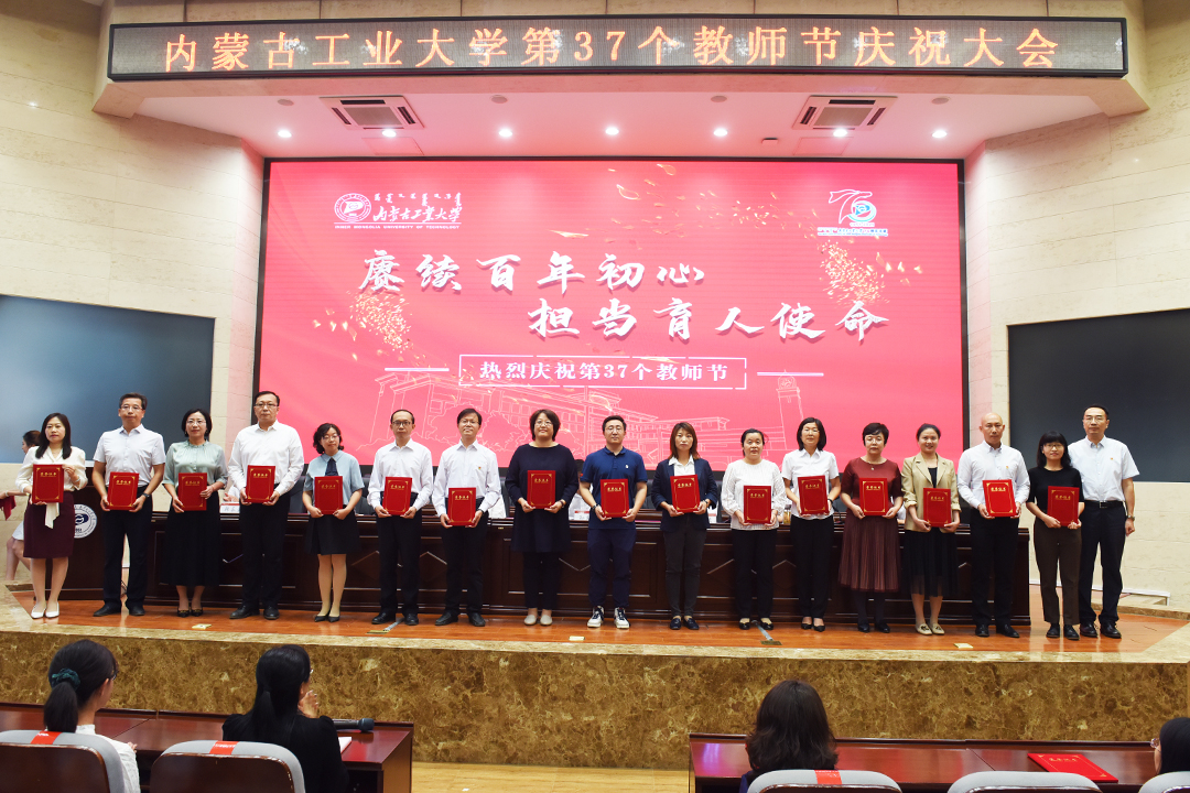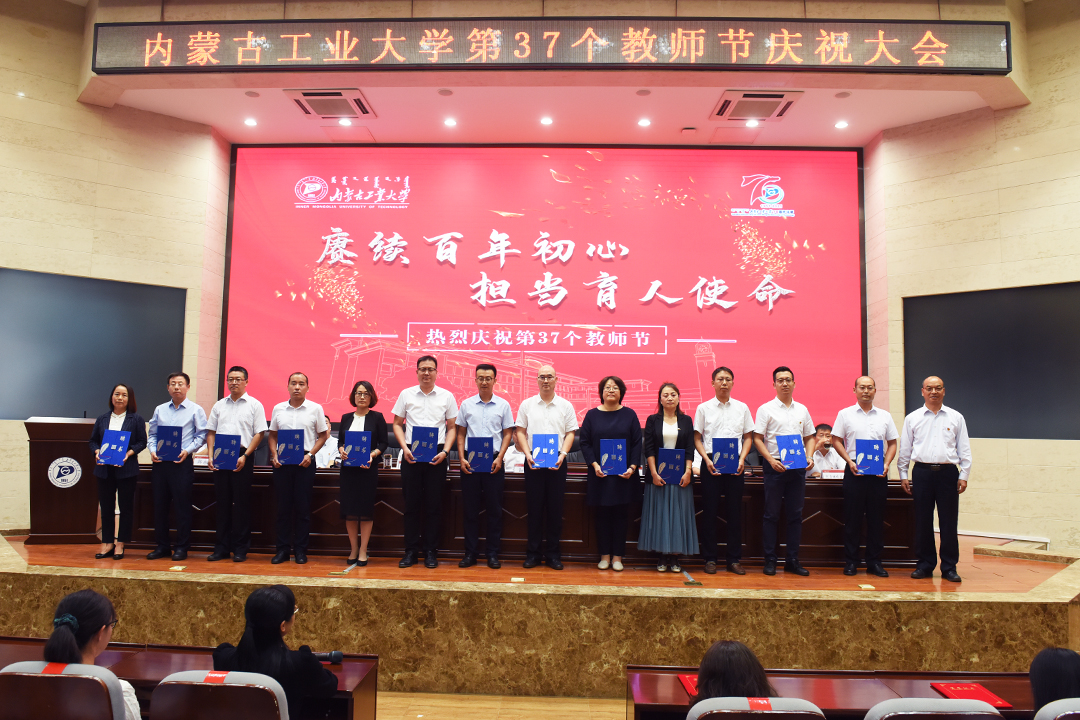 在第37个教师节来临之际,为弘扬教师高尚的师德师风,营造尊师重教的浓厚氛围,9月10日下午,内蒙古工业大学在新城校区明德楼第一报告厅隆重举行教师节庆祝大会。校领导孙国权、姚德、栗文义、峻峰、吕晓琪、阿力坦嘎日迪、韩永全出席,副校长峻峰主持大会。各单位各部门主要负责人、退休教师代表、从教30年教师代表、2021年新聘教授、受表彰教师代表、新入职教师等180余人参加大会。