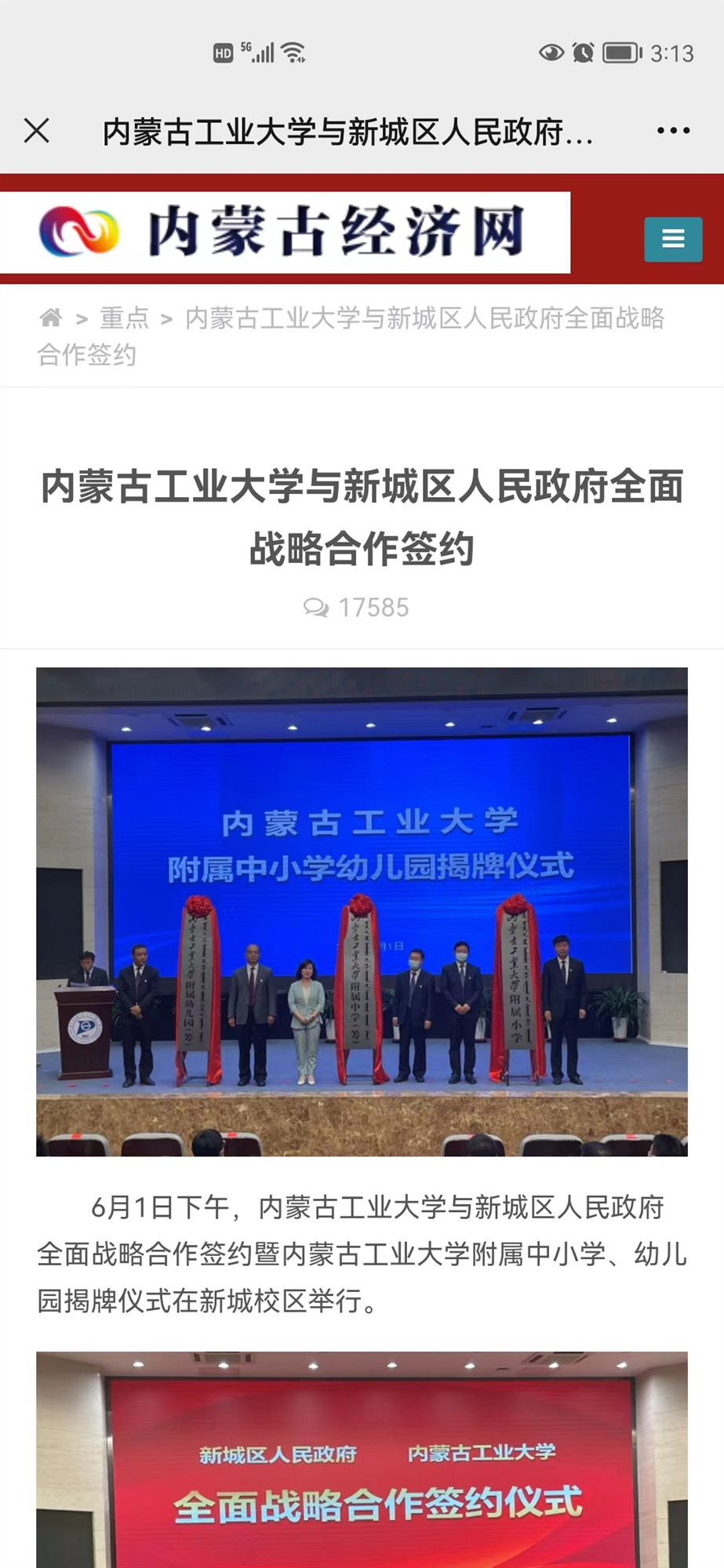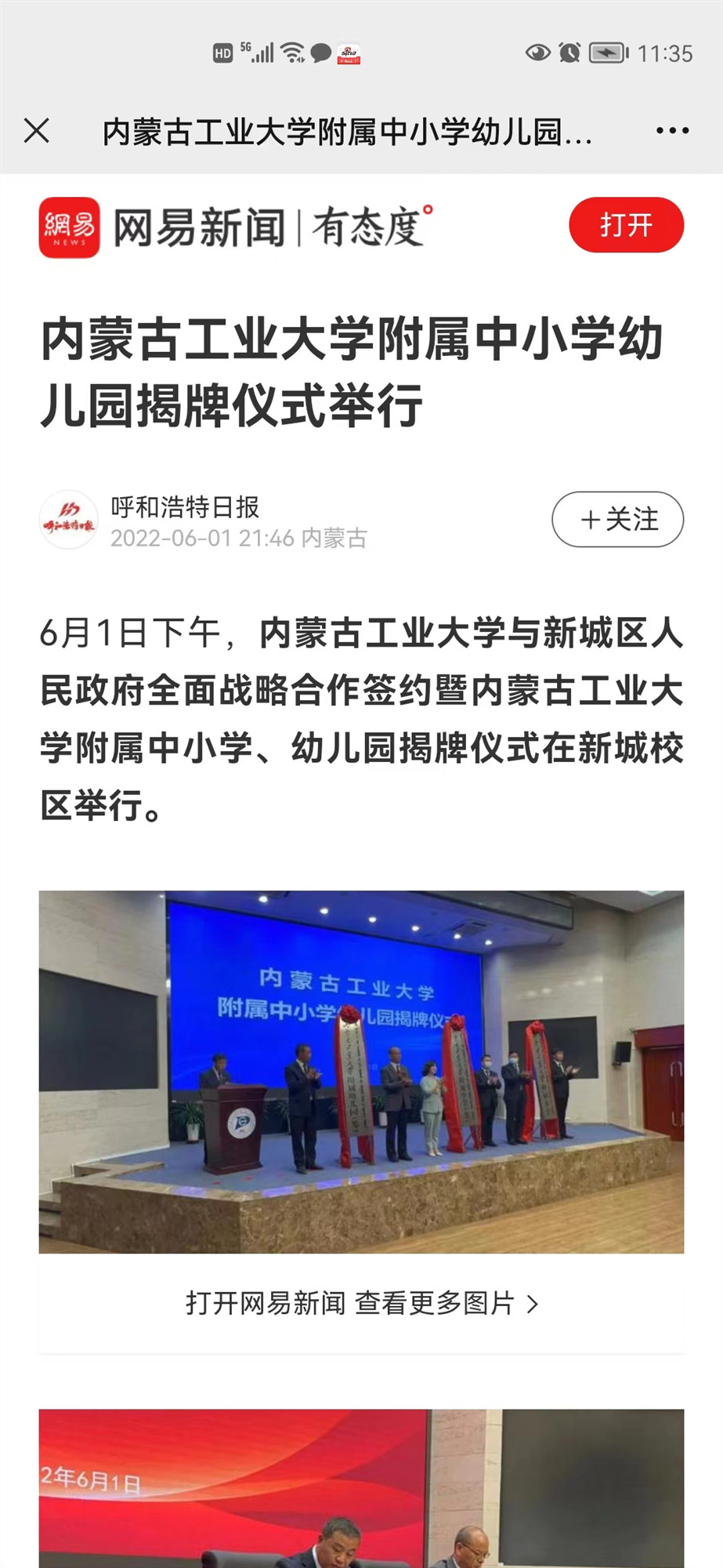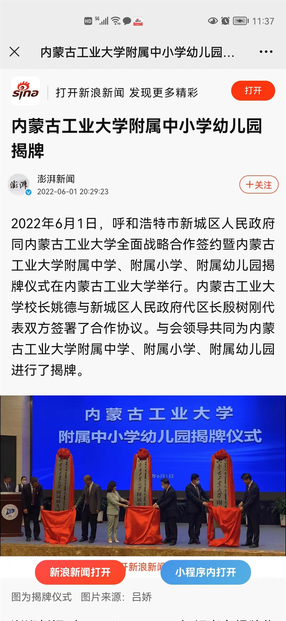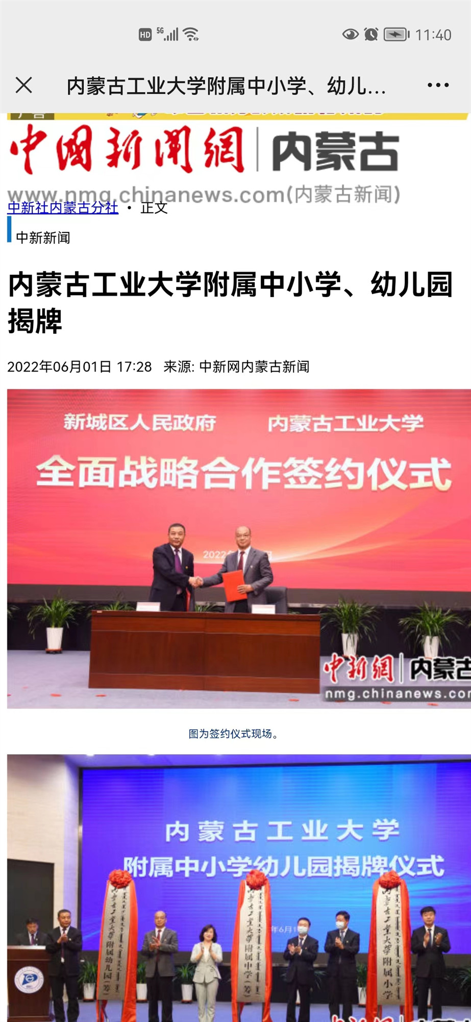 多家知名新闻媒体广泛关注报道我校与新城区人民政府举行全面战略合作签约暨内蒙古工业大学附属中小学幼儿园揭牌仪式