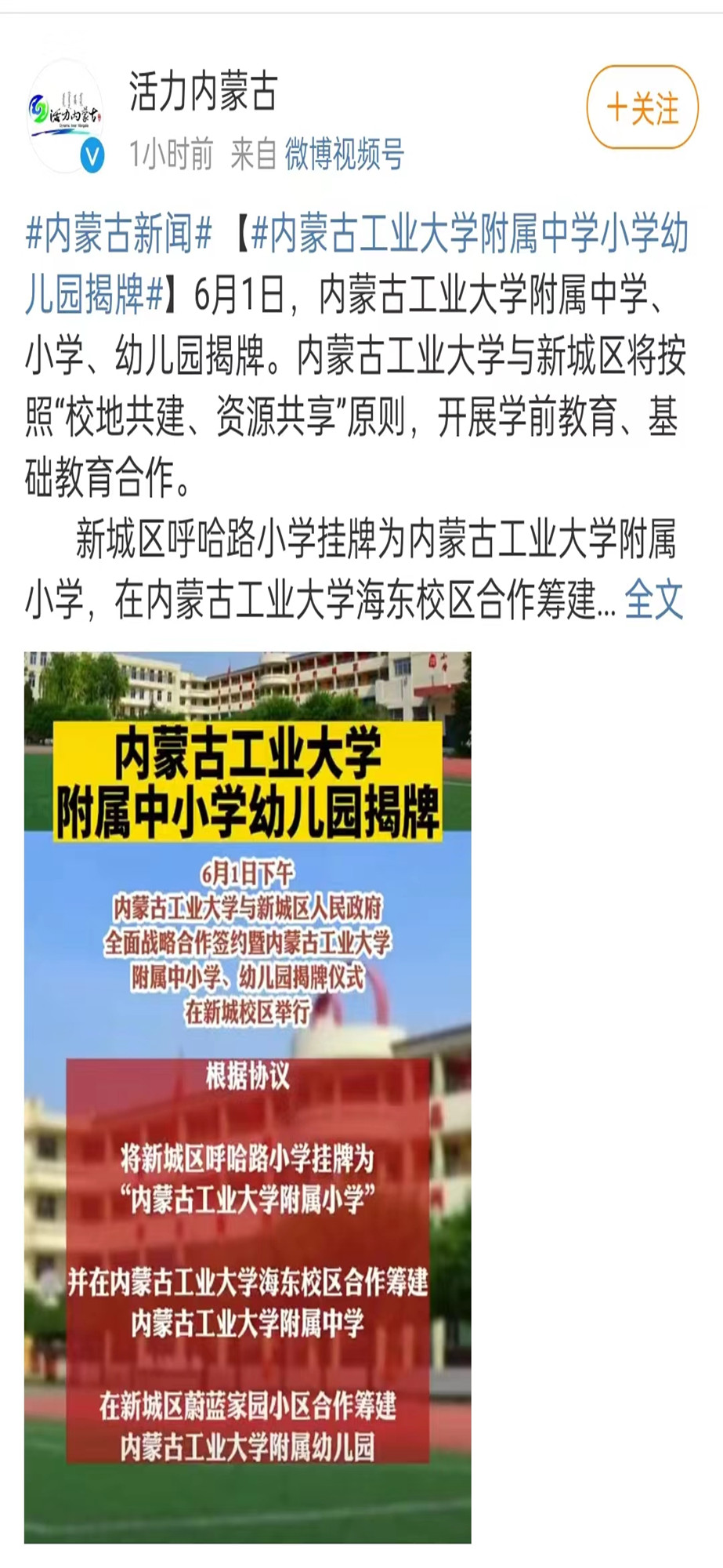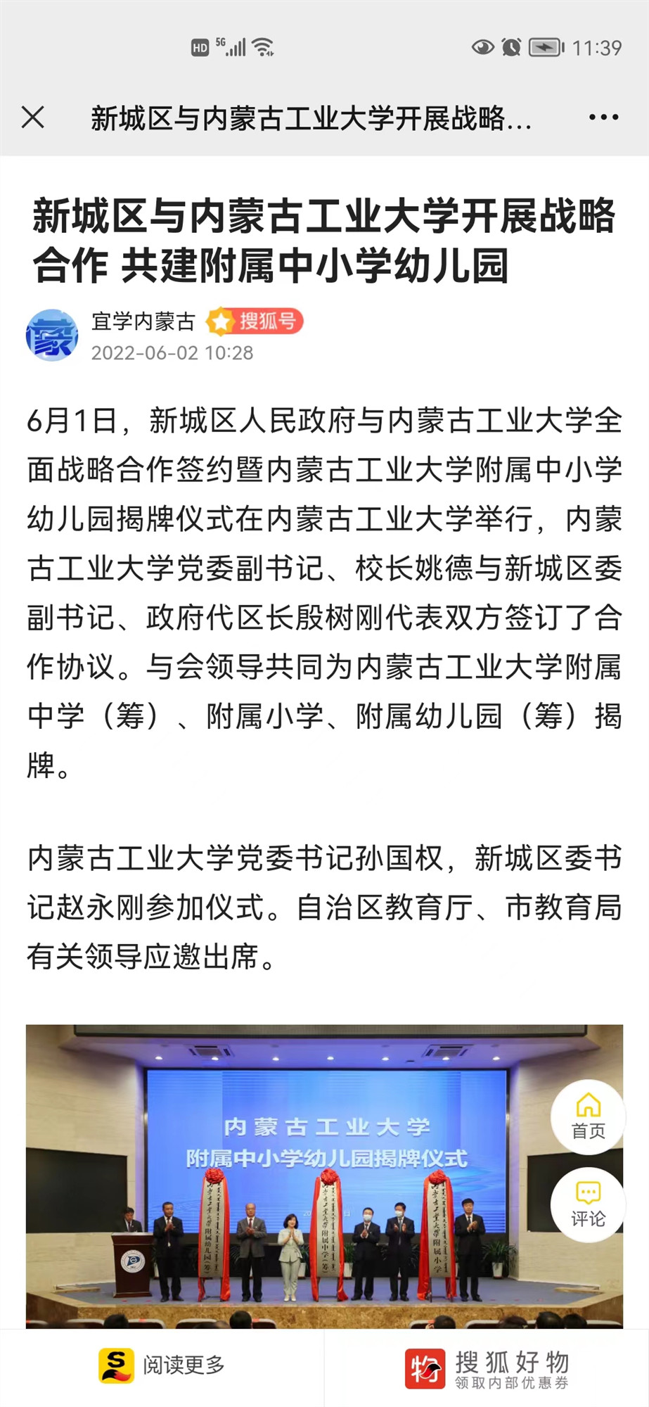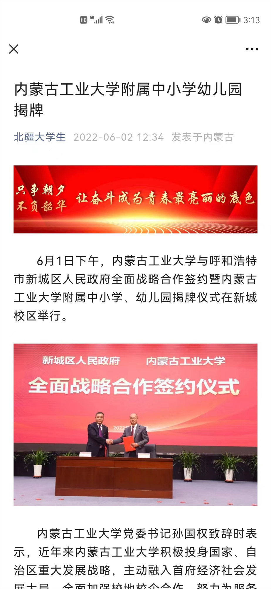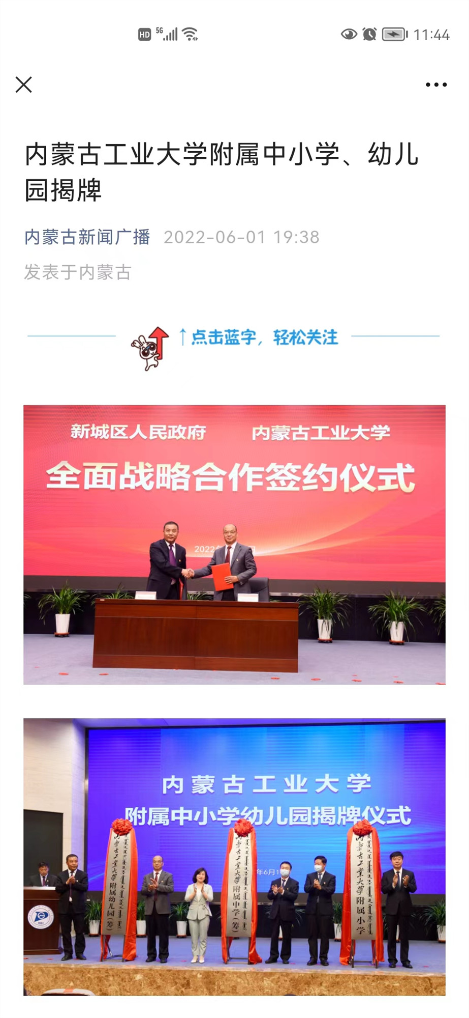 多家知名新闻媒体广泛关注报道我校与新城区人民政府举行全面战略合作签约暨内蒙古工业大学附属中小学幼儿园揭牌仪式