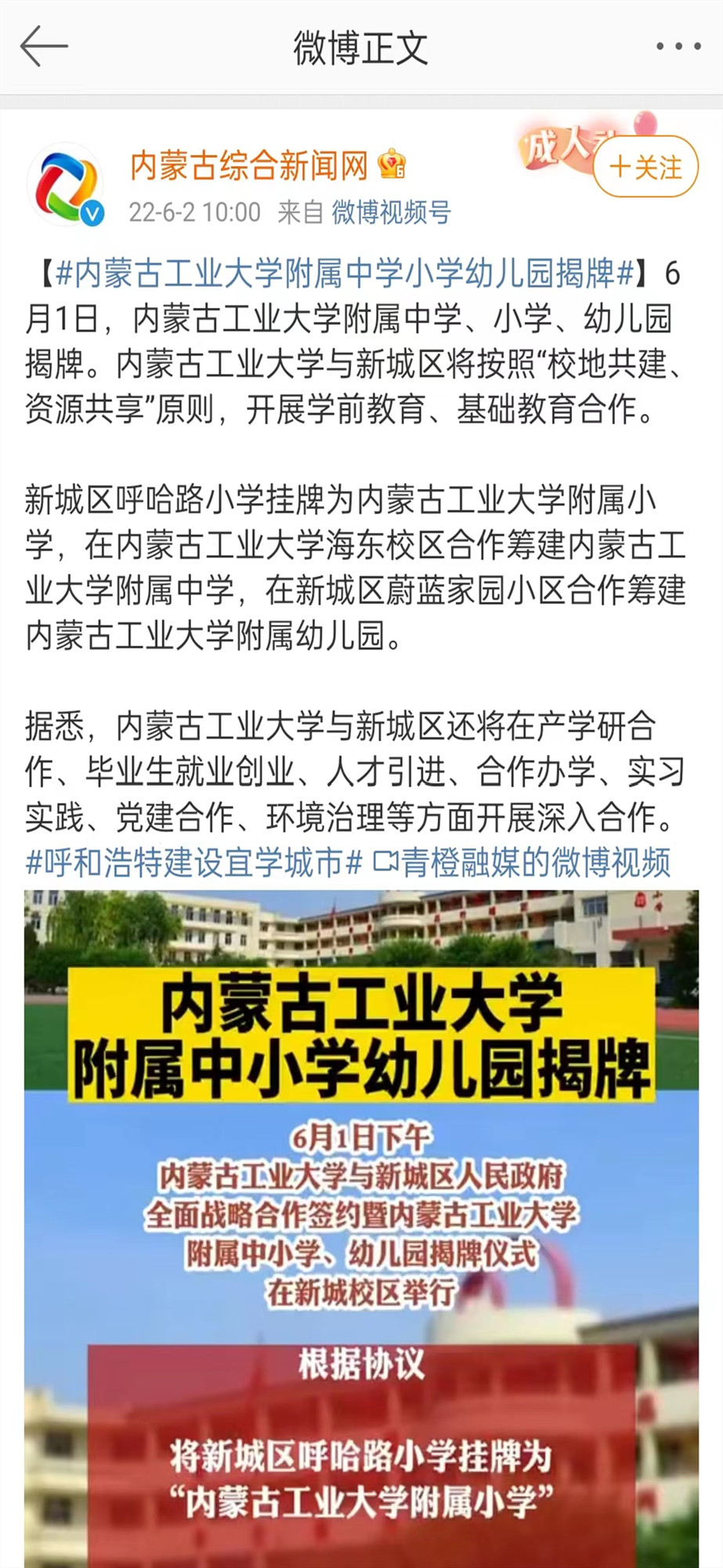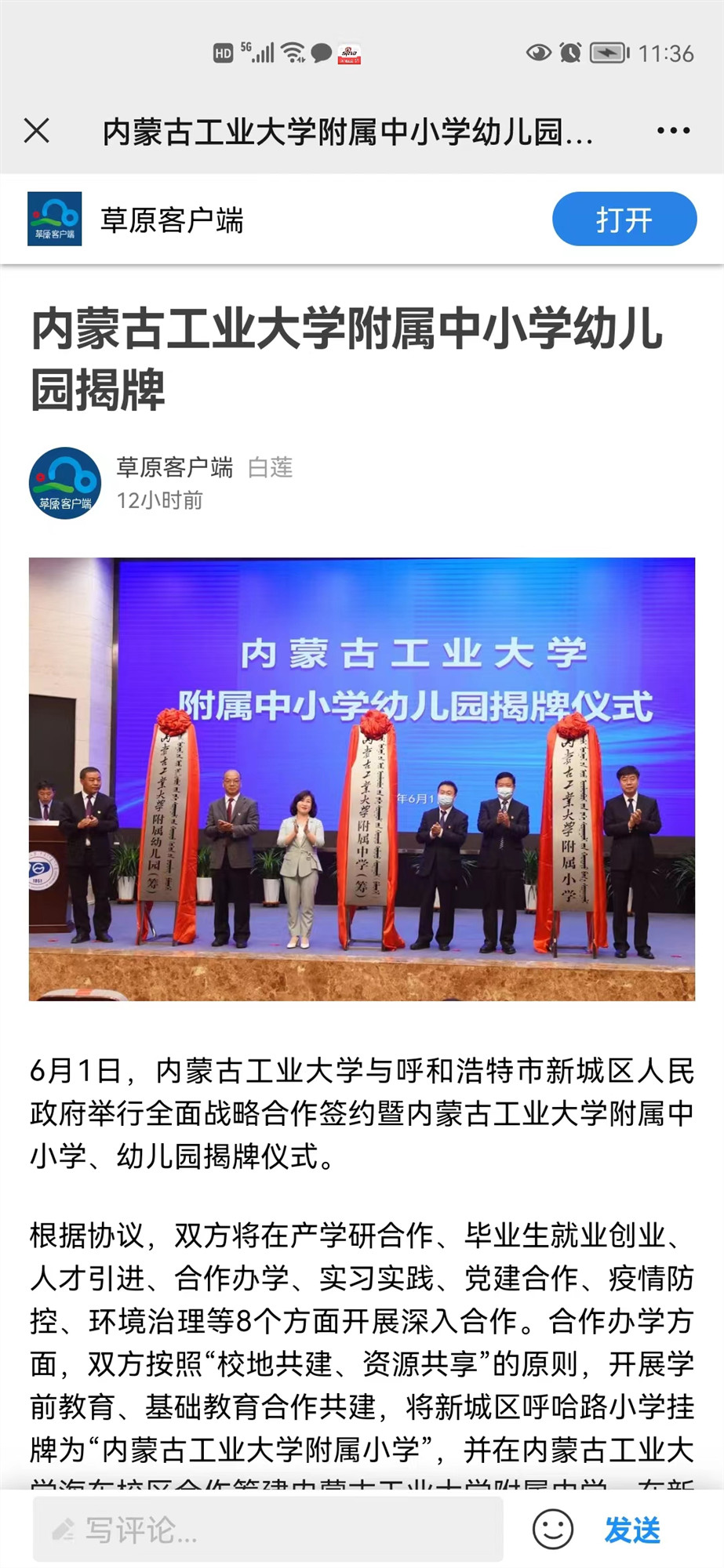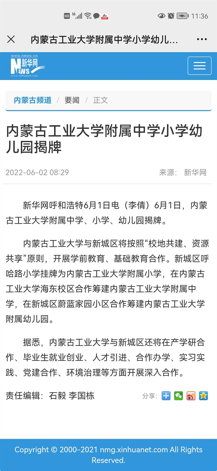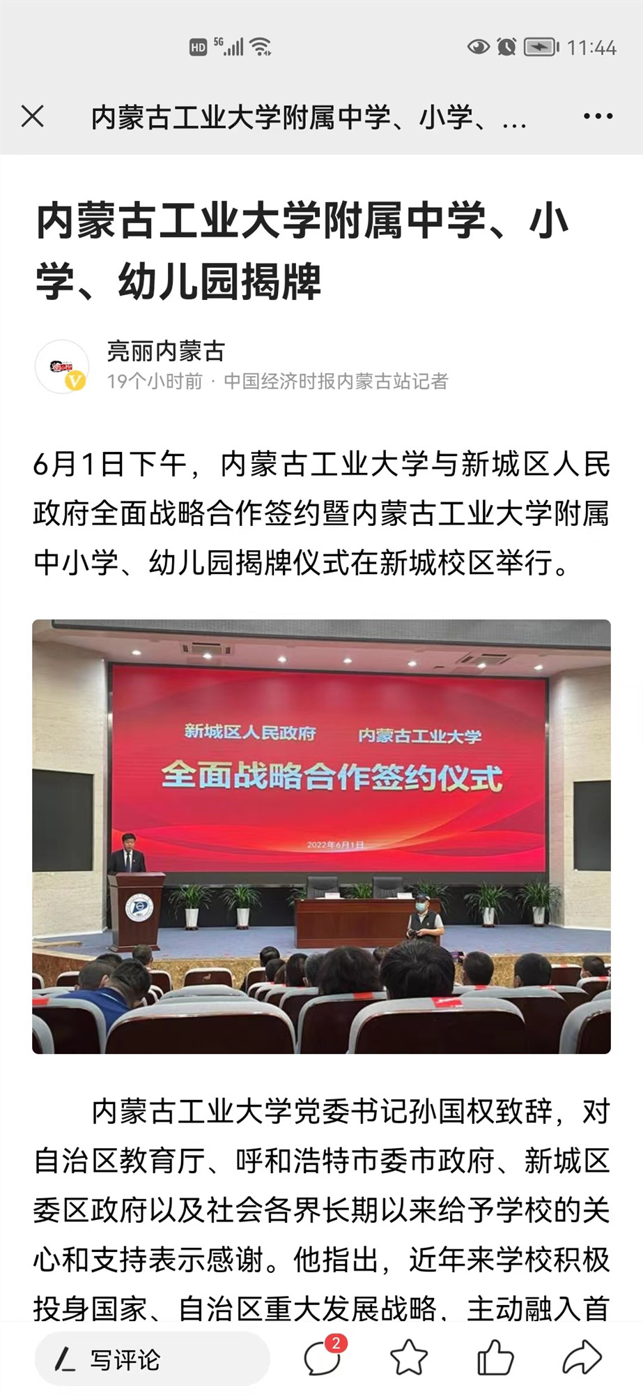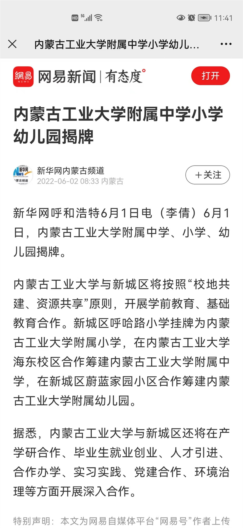 多家知名新闻媒体广泛关注报道我校与新城区人民政府举行全面战略合作签约暨内蒙古工业大学附属中小学幼儿园揭牌仪式