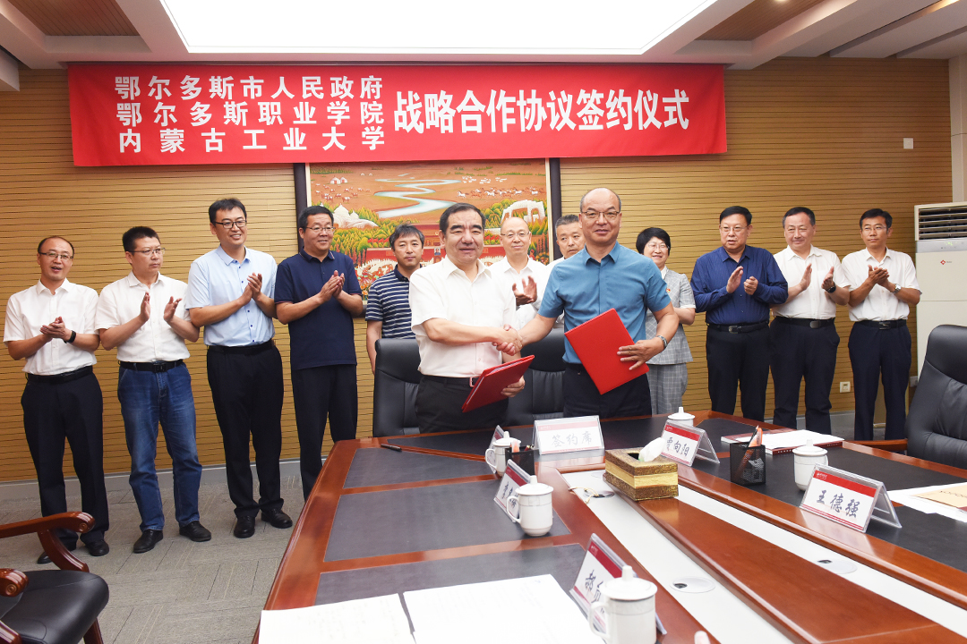 在与会人员的共同见证下,王心宇、姚德签署鄂尔多斯市人民政府与内蒙古工业大学全面战略合作框架协议,鄂尔多斯职业学院院长张建林、韩永全签署鄂尔多斯职业学院与内蒙古工业大学全面合作框架协议。