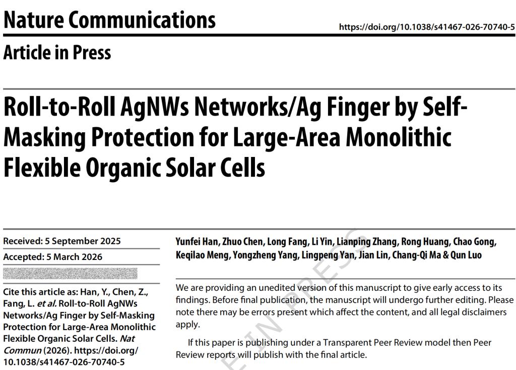 相关成果以《Roll-to-Roll AgNWs Networks/Ag Finger by Self-Masking Protection for Large-Area Monolithic Flexible Organic Solar Cells》为题发表于国际期刊《Nature Communications》(期刊影响因子15.7,韩云飞副研究员为本论文第一作者兼通讯作者,内蒙古工业大学为该论文第二单位)。