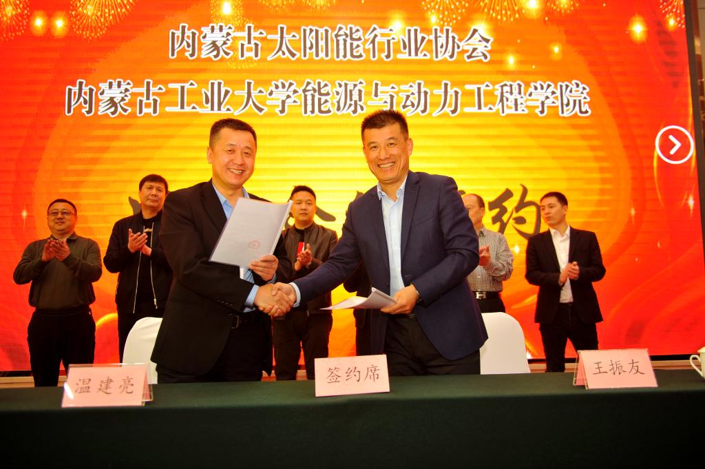 会上,王振友与内蒙古太阳能行业协会会长温建亮代表双方签订了战略性合作框架协议赵明智介绍了学院太阳能利用技术团队和研究领域基本情况