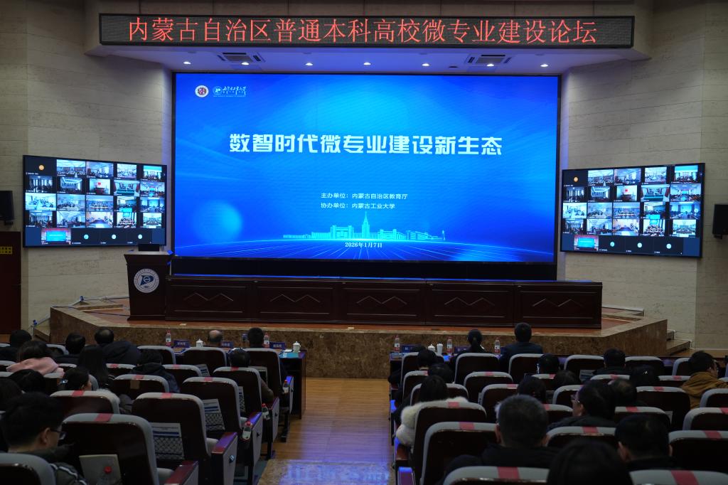 17午,由自治区教育厅主办,我校承办的内蒙古自治区普通本科高校微专业建设论坛新城校区明德楼第一报告厅举行。本次论坛以“数字时代科技专业建设新生态”为主题,围绕微专业建设的路径探索、实践创新与跨校协同展开深入研讨,旨在推动自治区高等教育产教融合,增强人才培养对产业发展的适应性和竞争力。自治区教育厅高等教育处处长席我校党委委员、副校长刘利强出席致辞教育厅高等教育处副处长郭利杰各学院教学副院长、微专业负责人、骨干教师及教学管理100余人线下参会,全区各高校700余名相关领导、管理人员及教师线上同步参加。开幕式由我校教务处副处长洪海龙主持。