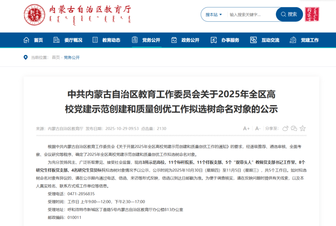 近日,自治区党委教育工委印发《关于选树2025年全区高校党建示范创建和质量创优工作命名对象的通知》,我校成功入选2025年全区高校党建“标杆院系”“双带头人”教师党支部书记工作室、研究生样板支部、研究生党员标兵4项荣誉。