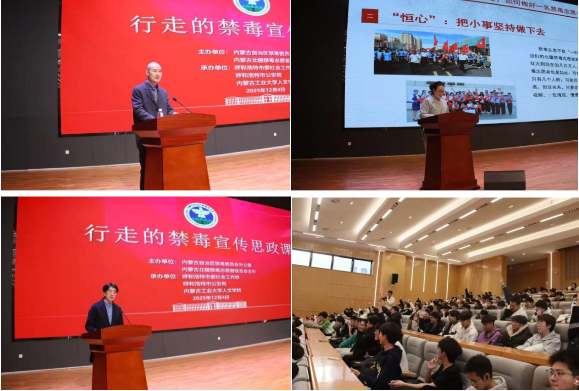 12月4日,我校联合自治区禁毒委员会举办“筑牢禁毒防线,青春不‘毒’行”——“行走的禁毒宣传思政课”主题活动,邀请内蒙古禁毒首席形象大使陶迎春、公安禁毒民警、自治区血液中心医师胡泽文到校宣讲,结合真实案例,详细讲解合成毒品的伪装形式、涉毒的法律后果等内容,将禁毒教育与法治宣传有机融合,有效提升广大学生自我保护意识和法治观念。