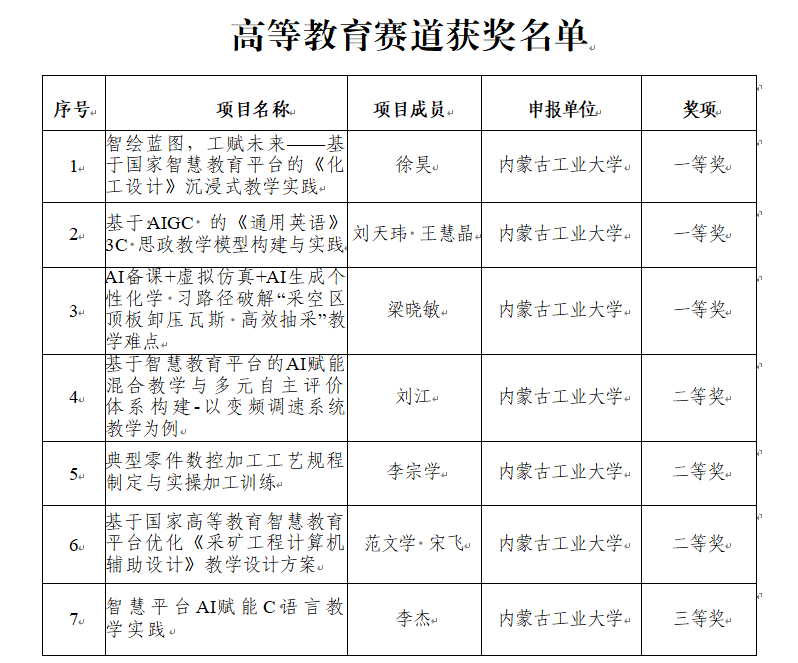 近日,由自治区教育厅主办、呼和浩特职业技术大学承办的全区首届国家智慧教育平台应用能力竞赛在呼和浩特市举办。经初赛遴选、现场决赛激烈角逐我校获一等奖3项、二等奖3项、三等奖1项佳绩,获奖数居全区高等教育赛道前列,创同类高校最佳成绩。