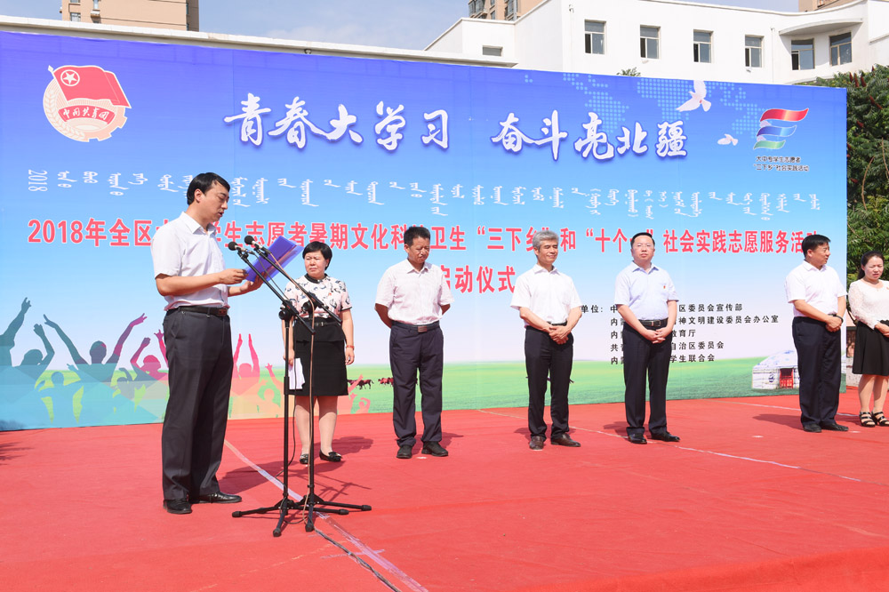 2018年全区大中学生志愿者暑期“三下乡”和“十个一”社会实践服务活动在我校启动7月6日上午,2018年全区大中学生志愿者暑期“三下乡”和“十个一”社会实践服务活动启动仪式在我校举行。自治区团委书记、党组书记陈晓东,自治区团委副书记刘晓宇,校...