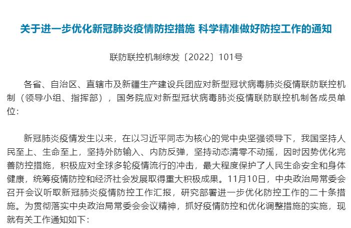 进一步优化防控工作的二十条措施公布11月11日,国务院联防联控机制综合组发布《关于进一步优化新冠肺炎疫情防控措施 科学精准做好防控工作的通知》,公布进一步优化防控工作的二十条措施。 通知指出,...