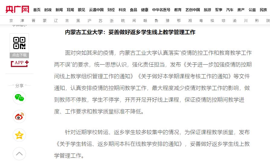 央广网报道我校妥善做好返乡学生线上教学管理工作11月9日,央广网报道我校为切实保障学生返乡后教育教学活动有序开展,及时完善线上教学工作安排,妥善做好返乡学生线上教学管理工作,保障学生返乡不停学、线上学习不断...