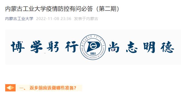 内蒙古工业大学疫情防控有问必答(第二期)返乡前应该做哪些准备? 符合返乡条件的学生,出行前要提前准备好行囊,收纳好个人贵重物品和学习生活物品,确保随时安排随时出发。及时关注自身健康状况,如出现发热...