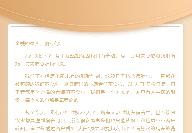 凝聚 | 写给挂念我们的家人朋友的一封信我们知道你们有千万丝担忧因我们而牵动,有千万句关心想对我们嘱托,请先放心听我们说。 我们正在经历前所未有的艰难时刻,这段日子将永远难忘,一直都在被照顾的我...