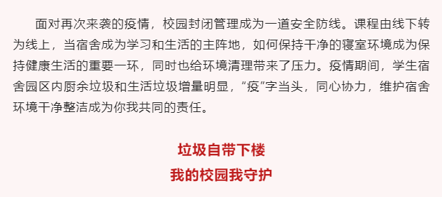 垃圾自带下楼,我的校园我爱护!面对再次来袭的疫情,校园封闭管理成为一道安全防线。课程由线下转为线上,当宿舍成为学习和生活的主阵地,如何保持干净的寝室环境成为保持健康生活的重要一环,同时也...