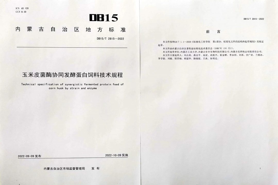 我校牵头编制的两项自治区地方标准正式发布近日,经自治区市场监督管理局审查批准,我校牵头编制的《玉米皮菌酶协同发酵蛋白饲料技术规程》(DB15/T 2815-2022)和《玉米皮固态发酵菌体蛋白饲料技术规程》(DB15/...