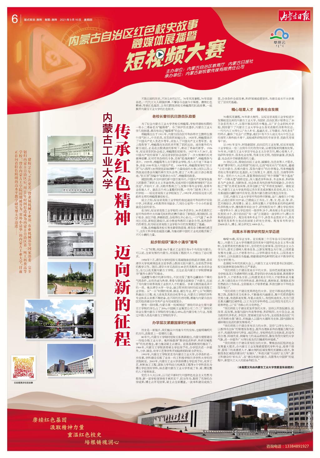 建校70周年校庆日当天《内蒙古日报》整版刊发文章:内蒙古工业大学——传承红色精神 迈向新的征程建校70年,9次更名,曾隶属机械工业部、农业机械部等国家部委。完全划归内蒙古自治区后,用10年时间打造成为内蒙古自治区第一所工科类高等学校!曾在内蒙古工学院时期被...